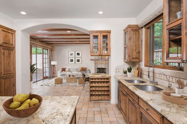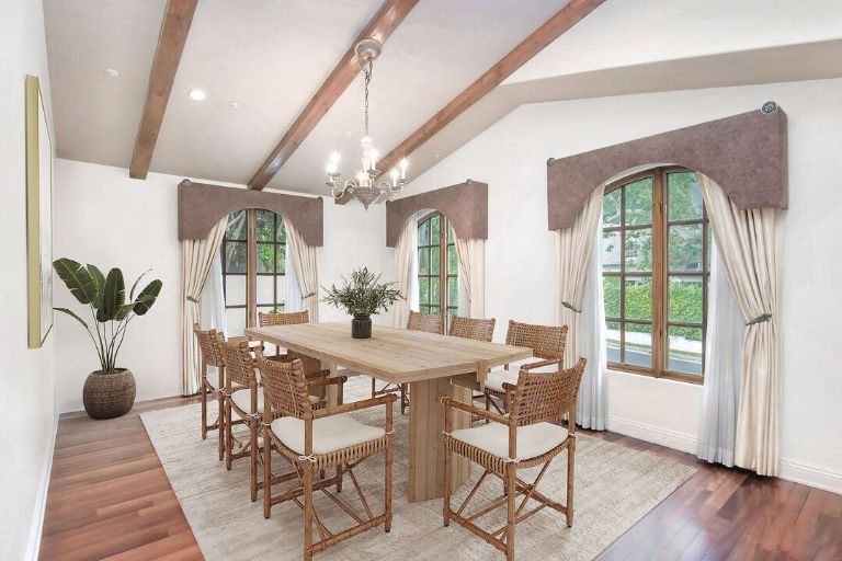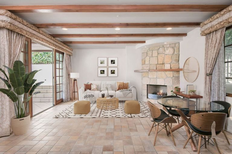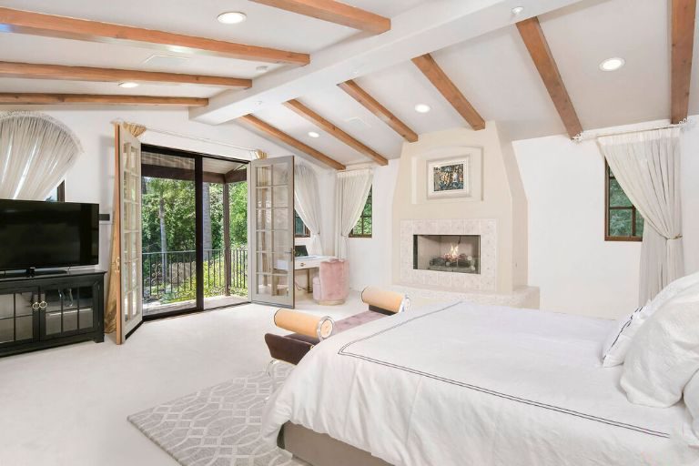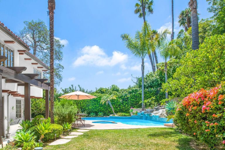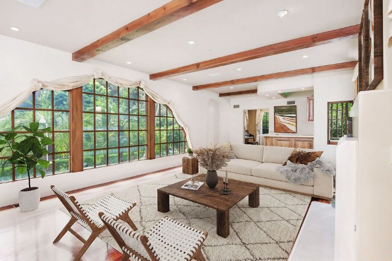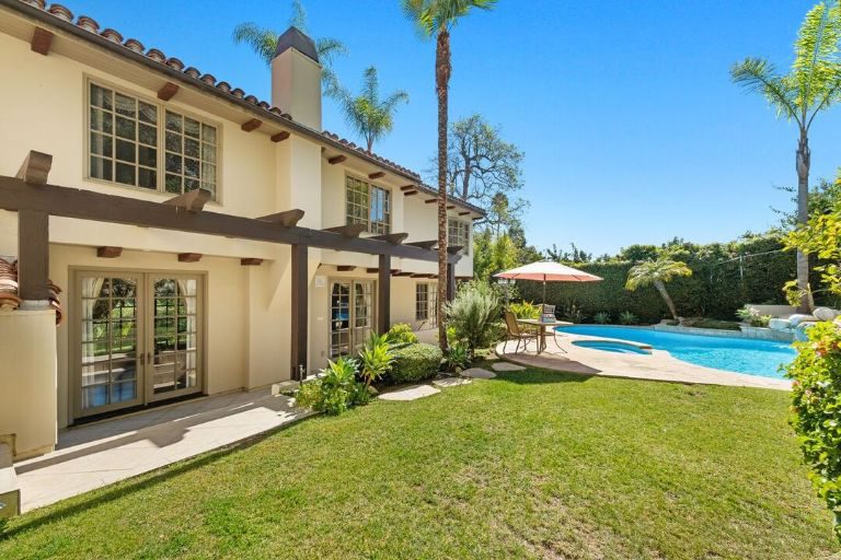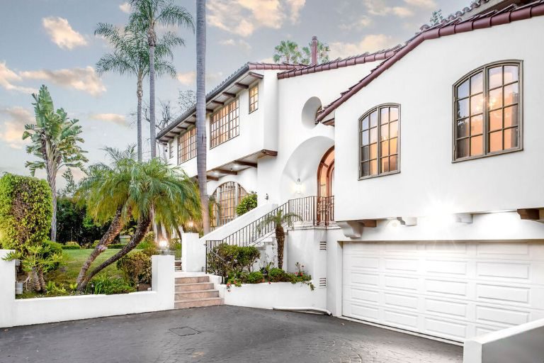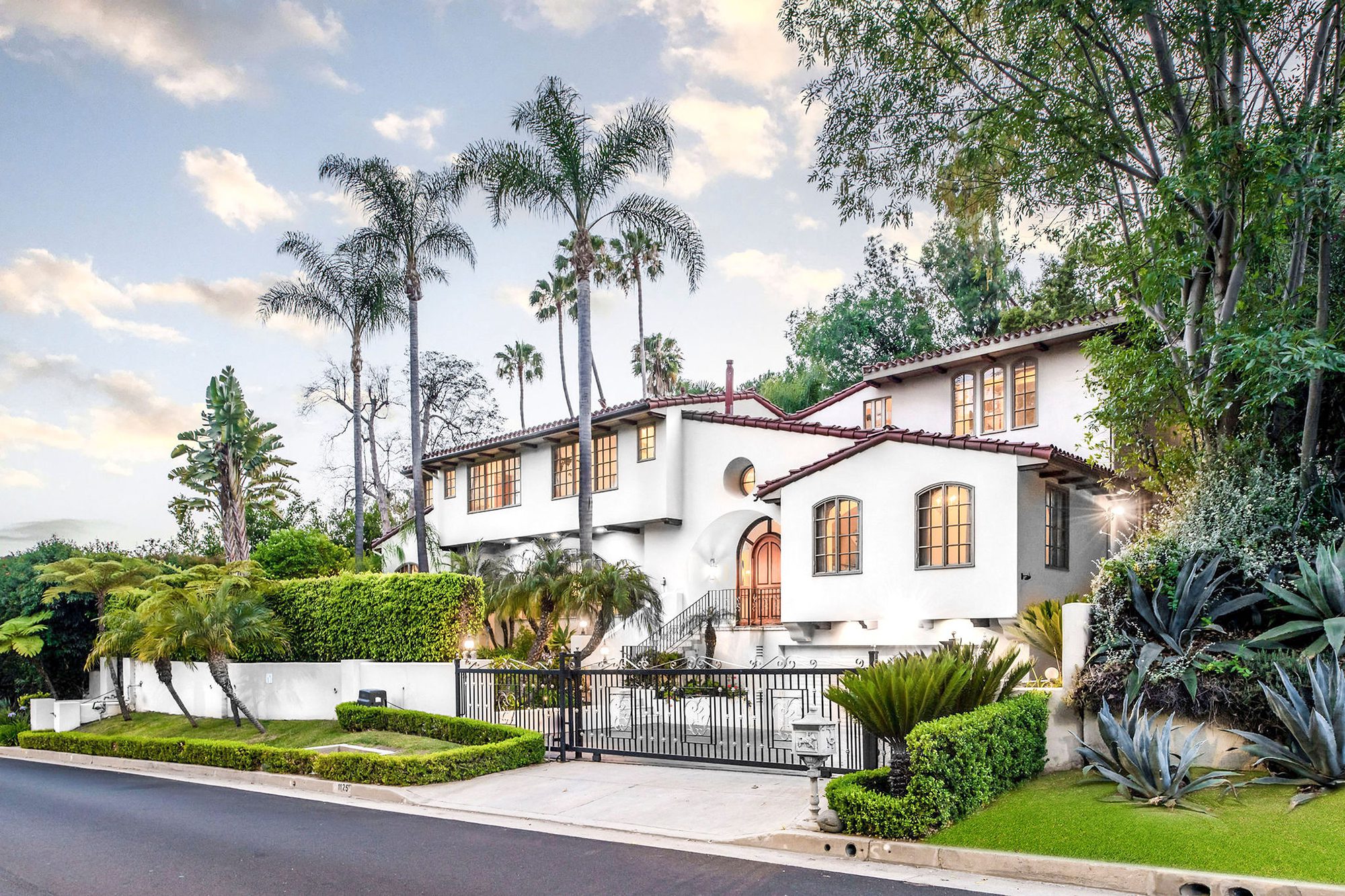 Gated Spanish Contemporary, private compound in City of Beverly Hills features impeccable detail including tile pavers, custom carved doors and archways, crafted rooms of pitched beamed ceilings, and walls of picture-style windows. 6,000 sq feet|12,426 sq ft lot, 5 bedroom, 7 bathroom. Bright open primary master bedroom with a fireplace, walk-in closet, bathroom w/ spa, steam shower, soaking tub, and Juliet balcony overlooking a peaceful, outdoor oasis. Four additional ensuite bedrooms complete the upstairs, a basement game room, gym option, along with guest suite below. Showcasing a sparkling blue pool, Jacuzzi spa, rock waterfall, and lounge for complete serenity. Flower garden boasts manicured landscaping, surrounded by pine, bamboo, and palm privacy trees. Blocks from Sunset, set behind large gates, two-car garage, driveway hosts up to 6 cars.
