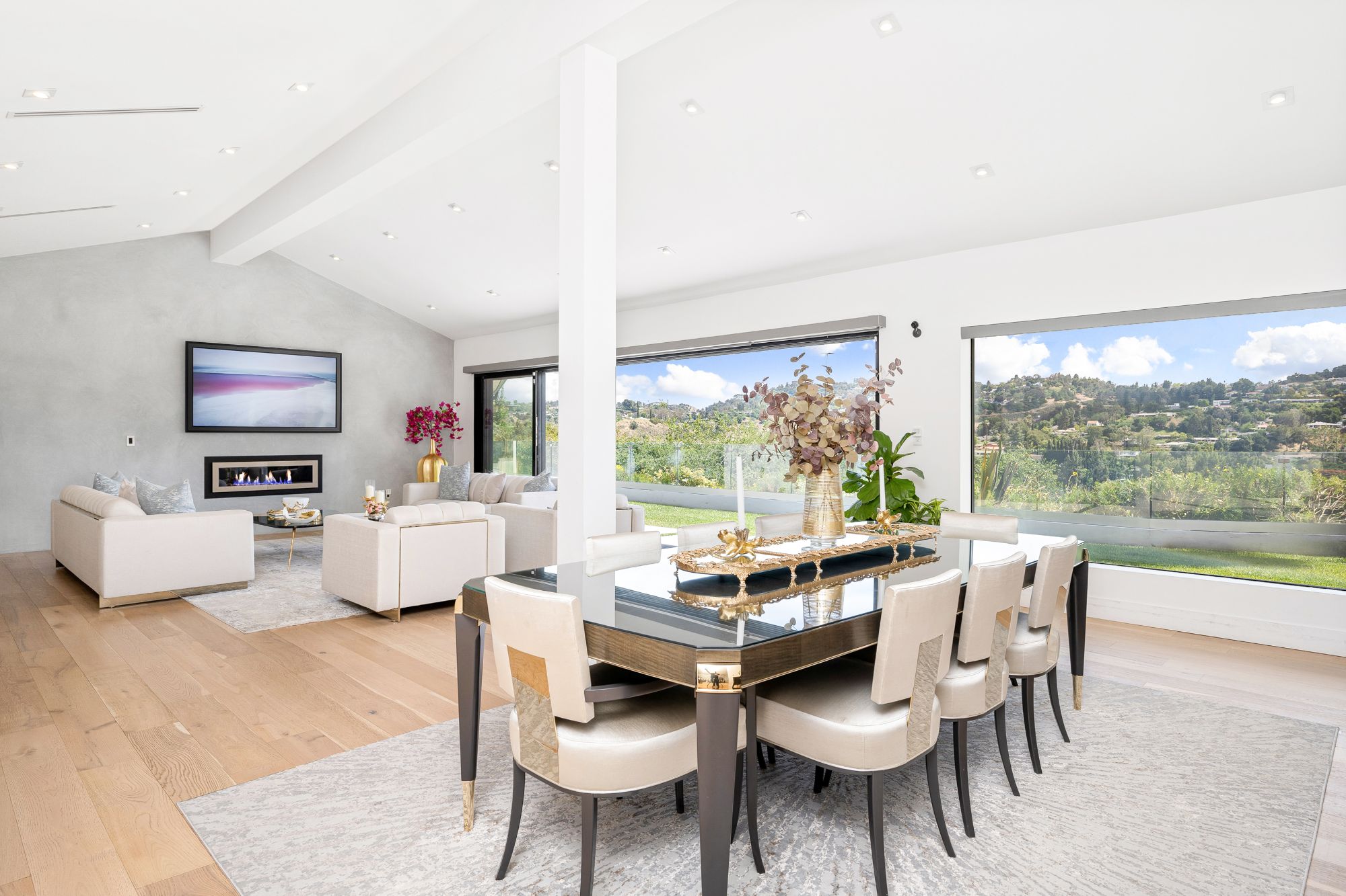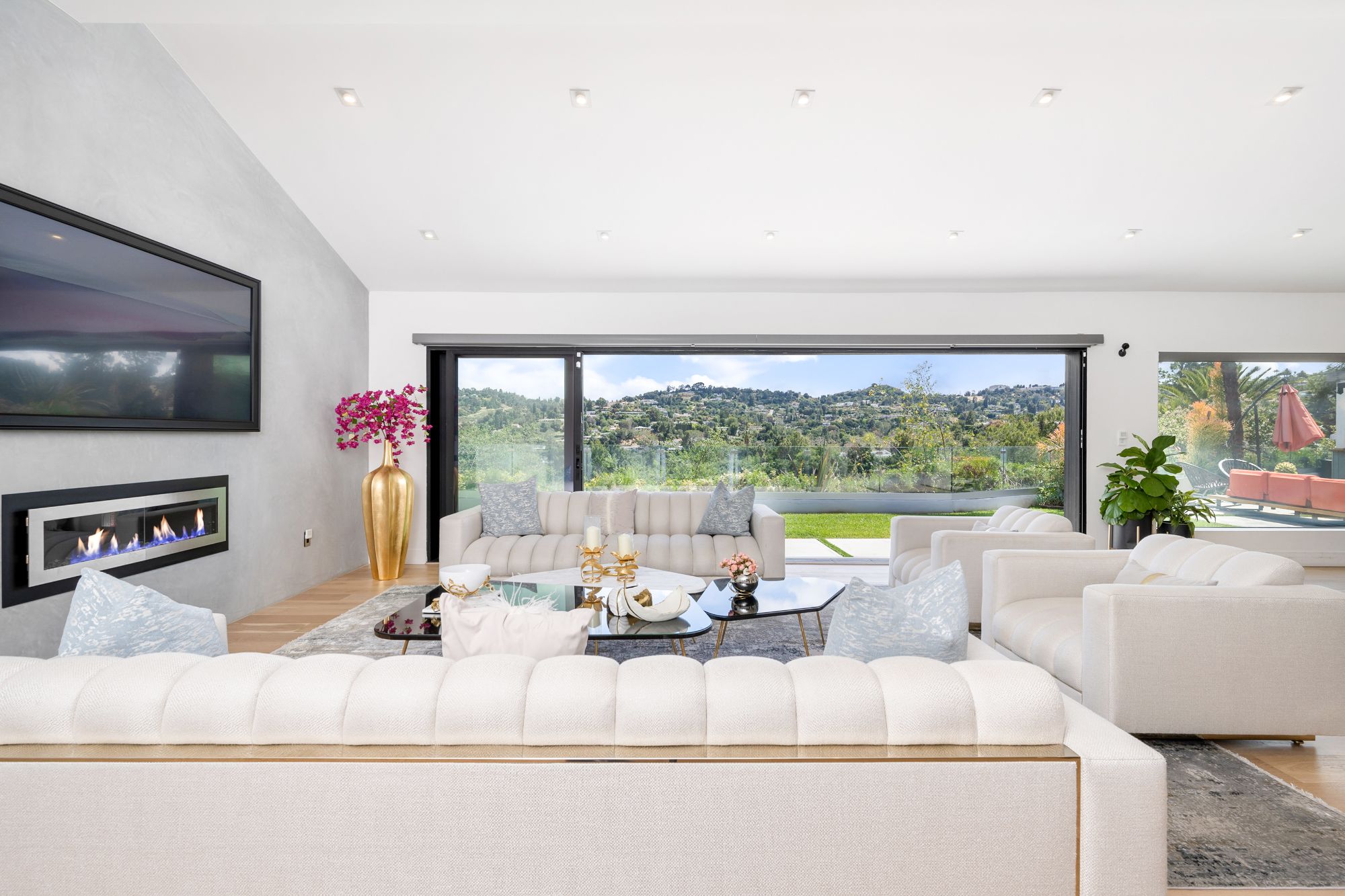 Mid Century modern remodeled in Royal Oaks - the exclusive celebrity enclave area of Encino. This gated California Contemporary sits above the street and behind a gate and mature hedges for ultimate privacy. Enter through glass and metal double doors and beyond the foyer you arrive to a one story masterpiece with sliding glass doors that disappear as you look out onto breathtaking mountain views! Stainless steel framed fireplace and natural hardwood floors add to the elegant simplicity of the open floor-plan for the living room and dining room. The kitchen boasts all Thermador appliances: coffee station, 98 bottle wine fridge, double ovens with 6 burner stove and griddle, fridge and freezer. Quartzite white counters and island with a waterfall edge. Dine causally at the island or at the adjacent area that could be used as a family or game room. Library/study and a media room with a surround sound system. Spacious primary suite offers private sitting area with fireplace, two walk-in closets, a spa-like bathroom with dual shower, soaking tub, dual sinks. Additional amenities include smart home technology perfect for modern living. Google operated one-click smart ready home with NEST thermostats, security cameras, Ring doorbell. Gated driveway with two-car garage plus carport and room for additional cars in driveway. The landscaping is equipped with multi-colored night lighting. Backyard oasis offers a spacious green lawn, swimming pool, outdoor bar with BBQ, fire pit. Don't miss this incredible opportunity to live in this peaceful neighborhood with 24/7 security patrol. Central location close to valley shops and restaurants with easy access to Mountaingate and Brentwood. Agent Remarks : Broker does not guarantee the accuracy of the information provided, including square footage, lot size, permitted or un-permitted spaces, and/or bedroom/bathroom count. Buyer is advised to independently verify the accuracy of this information through personal inspection, building permits and/or with appropriate professionals (i.e. attorney, appraiser, architect, contractor, etc.).