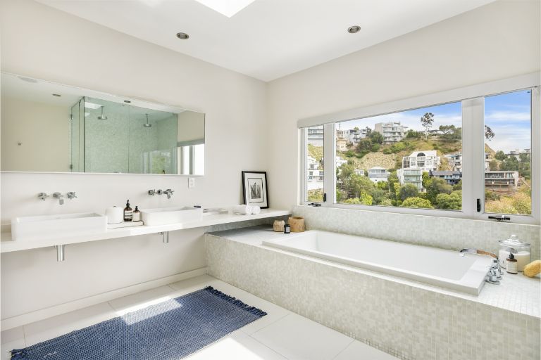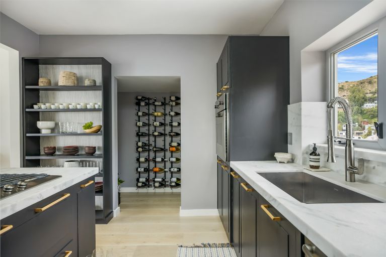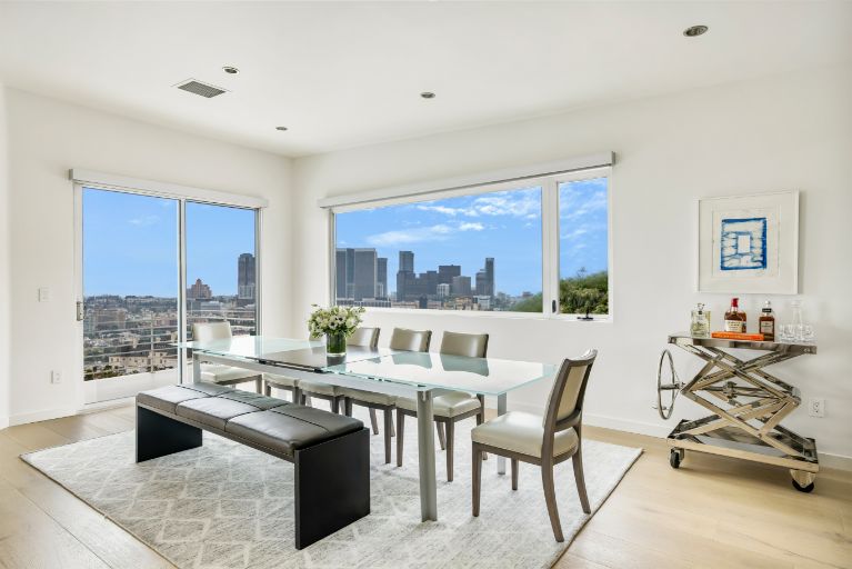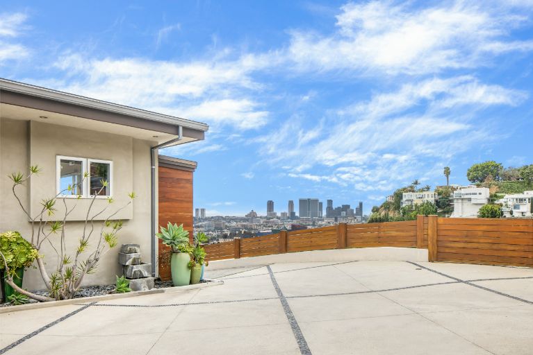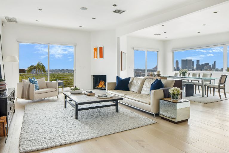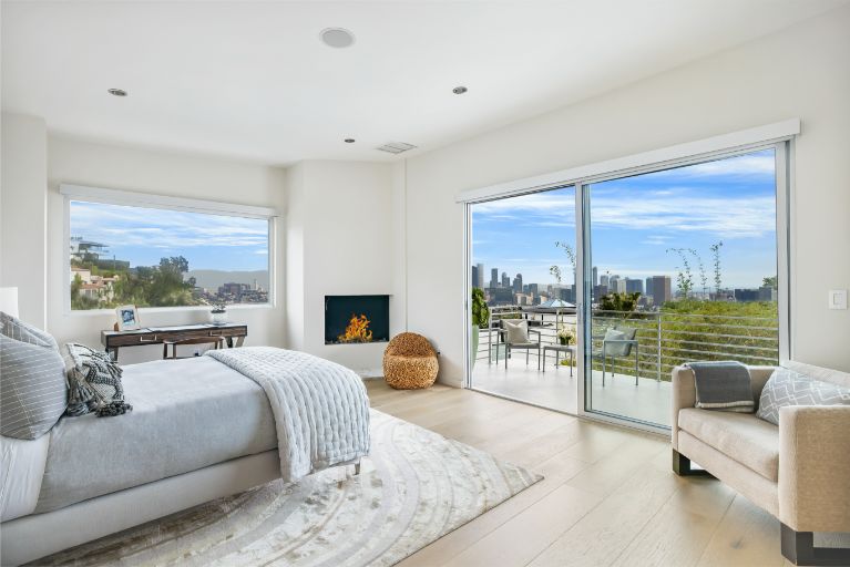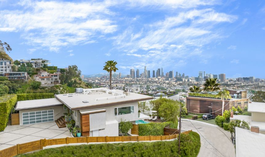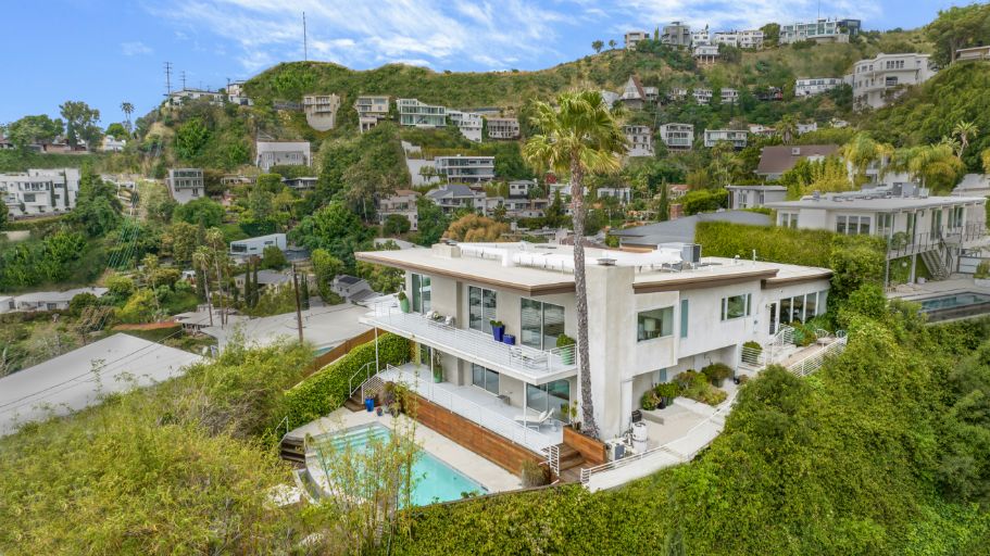 Set behind a gated driveway in the Hollywood Hills, this completely move-in home offers panoramic views from DTLA to Century City, sleek modern finishes, and a swimming pool surrounded by lush greenery for ultimate privacy. The approximately 2,761 sqft 3 bed and 4 bath home features a primary suite with floor-to-ceiling windows, a wood-burning fireplace, and an expansive deck. The kitchen is adorned with Viking and Sub-Zero appliances and a separate wine-storage. The lower level includes a secondary living room with sliding doors that open to the outdoor space and 2 en-suite guest bedrooms. Additional amenities include Lutron lights, multiple exterior security cameras, 3 fireplaces, and a 2-car garage with driveway parking for another 2.